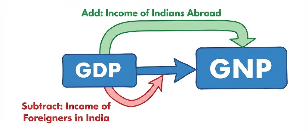 - The Shift from GDP to GNP: To get GNP, we take GDP, add the money Indians earn abroad, and subtract the money foreigners earn in India.